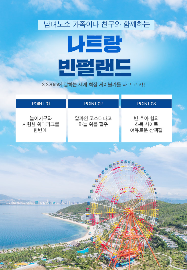 세상에서 가장 아름다운 만 29곳 중 하나에 위치한 세계적인 테마파크에서 하루 동안 즐거운 시간을 보내세요. 나트랑의 빈펄랜드는 신나는 놀이공원과 해변 워터파크가 합쳐져 남녀노소 모두가 즐거운 액티비티를 즐길 수 있는 곳입니다. 즐거운 여정은 빈펄랜드에 가기 전 케이블카에서 시작됩니다. 무려 3,320m에 달하는 세계 최장 케이블카를 타고 바다를 건너 나트랑 섬에 도착하세요. 넘치는 스릴을 즐기고 싶다면 360도로 끊임없이 회전하는 에볼루션 라이드를 타보세요. 아직 부족하다면 거대한 스카이 휠도 이용해보세요. 수영복을 입고 해변의 워터파크에 가는 것도 잊지 마세요. 공기를 가득 채운 장애물 코스가 마련되어 있습니다. 베트남 관광협회에서 베트남 최고의 놀이공원으로 뽑은 빈펄랜드에 방문하세요. 발걸음 닿는 어느 곳에서든, 어느 존에서든 평생 잊지 못할 즐거운 추억을 쌓을 수 있을 거예요.