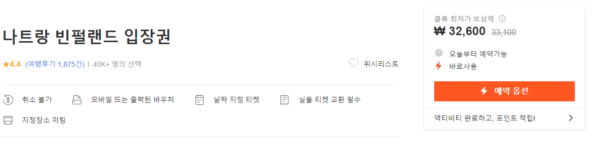 후기 상품 상세: 입장권 (편도 케이블카 포함) + 런치 뷔페 워터파크 너무빨리 닫아요. 워터파크에서 먼저놀아야함! 6시에 이미 어두워지고 불다꺼져서 전 물에 못들어가봄..ㅜㅜ 너무슬픔.. 뷔페는 그냥 한두접시 먹을만. 솔직히 만얼마짜리 밥은 아니지만 ㅋㅋㅋ 그냥 롯데리아햄버거 먹는게 더 나음ㅋㅋ 나같으면 다음엔 부페포함으로는 안살듯. 빈펄리조트에서 숙박하고 간거라 편도로 예약했더니 가격 3천원 더 싸짐. 7시 분수쇼 그럭저럭. 놀이기구2시간 기다려서 알파카 탄거 아주 후회함ㅋㅋㅋ 시간아깝 그럴만한 가치는 없었음 개인의견임 2019년 11월 19일