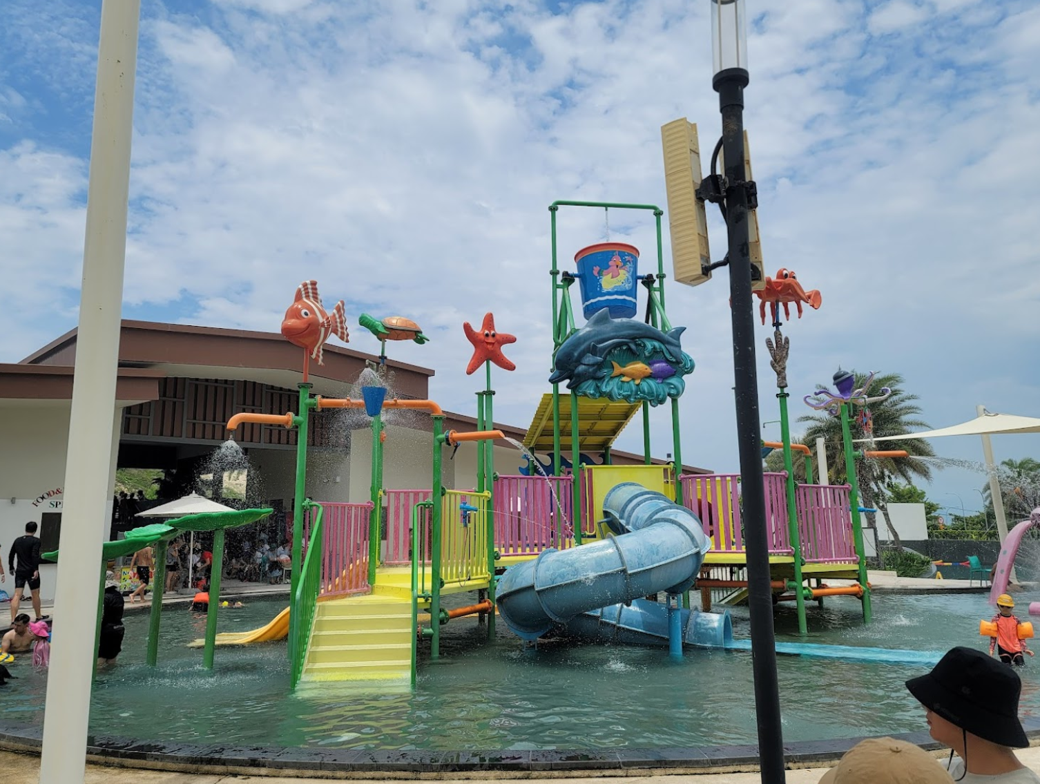 나트랑 알마리조트의 워터파크는 아이들과 함께 즐기기에 최적의 장소였습니다. 수영장은 무려 12개나 있었고, 슬라이드와 웨이브풀도 있었습니다. 물놀이를 하다가 배가 고프면 워터파크 옆에 있는 식당에서 간단한 음식과 음료를 주문할 수 있었습니다.