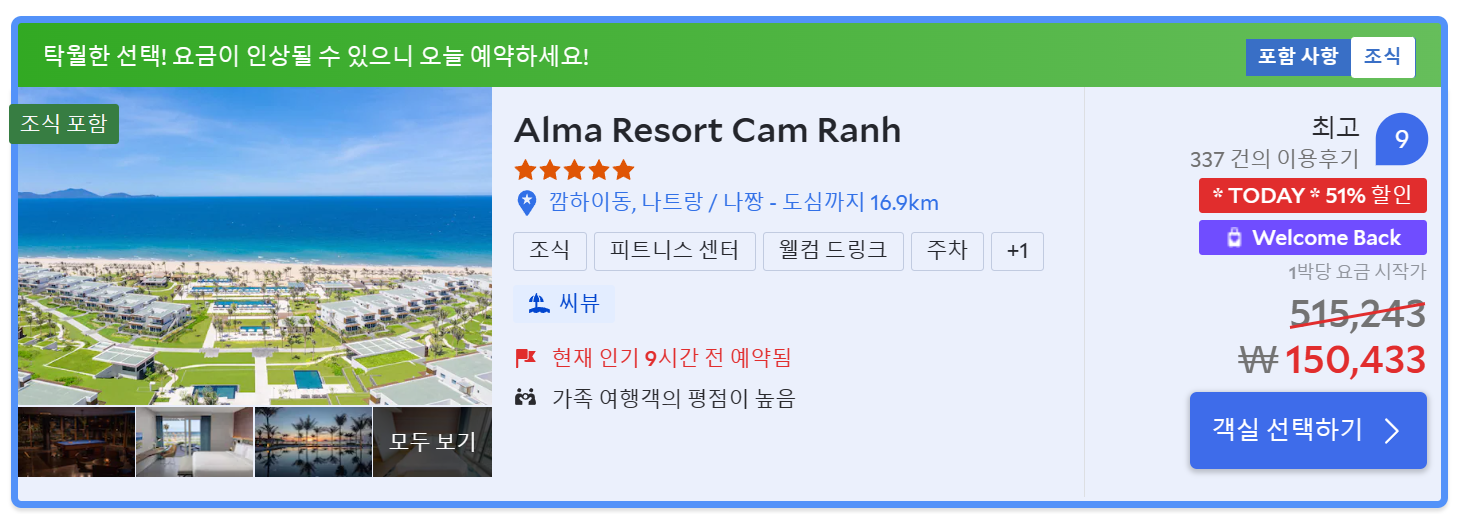 알마리조트 깜란은 감히 베트남 최고의 가족 리조트이며, 최상의 휴양 파라다이스라고 단언 할 수 있습니다. 사실, 숙박 전에는 큰 기대를 갖지 않고 찾아갔습니다. 그런데, 일행 모두의 예상을 뛰어넘는 기대 이상의 럭셔리한 숙박 시설과 직원들의 세련된 숙련도, 음식의 높은 퀄리티에 너무 놀랐습니다. 또한 넓고 다양한 시설의 워터 파크와 숙련된 스파 시설, 따분함을 날려준 유스클럽, 편안한 좌석의 시네마 극장, 다양한 음식을 한곳에서 맛볼 수 있는 푸드코트는 다양한 니즈에 완벽한 맞춤형 시설들이었습니다. 어디서도 볼 수 없는 베트남 알마리조트 깜란은 모든 분들의 눈높이를 한층 높여 드릴 것입니다.