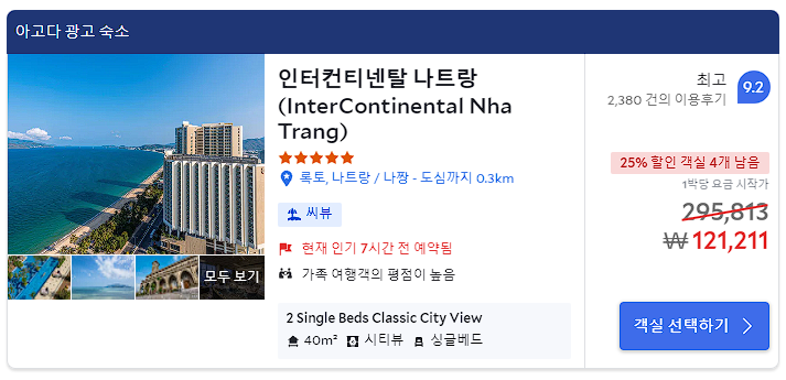 나트랑에서 가장 좋은 호텔로 평가받는 인터컨티넨탈 나트랑(Intercontinental)는 저렴한 숙박 시설부터 밤당 50,000원 미만의 가격으로 예약할 수 있는 총 16개의 호텔이 있습니다. 가장 기본적인 시티 뷰 기본 객실은 아침 식사 포함 약 150,000원/박의 가격대입니다.