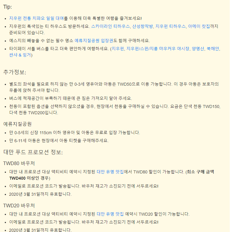 기간 한정 프로모션: 클룩에서 지정된 대만 액티비티 예약시 대만 유명 맛집에서 사용 가능한 TWD100 바우처가 제공됩니다!