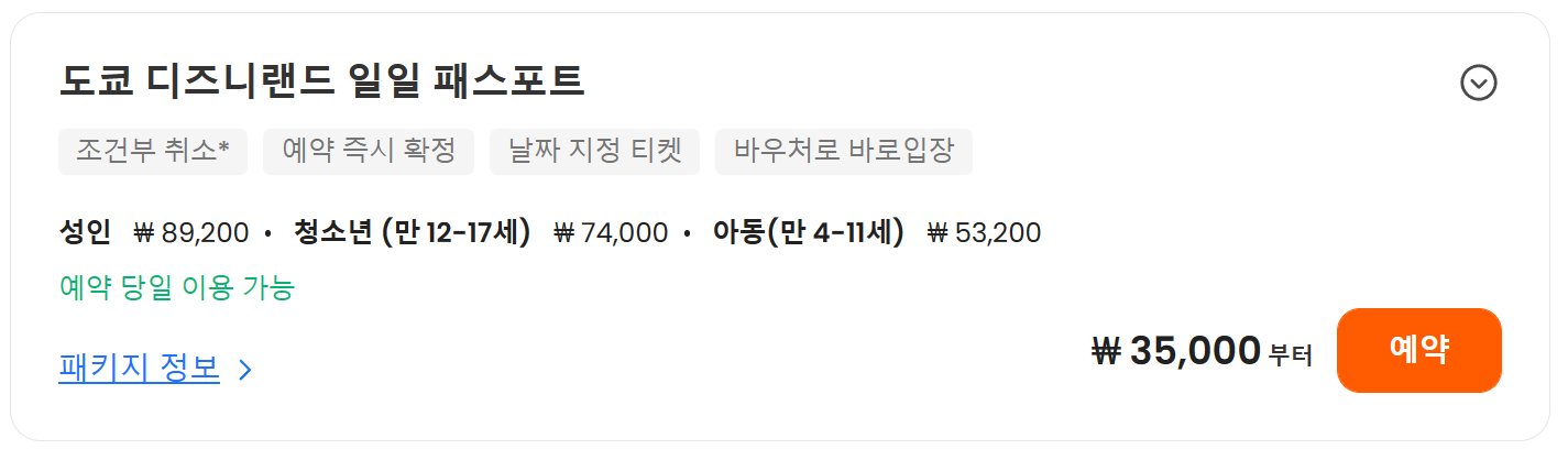 가격: 변동 가격 기준 날짜 지정 도쿄 디즈니랜드 티켓/입장권을 구입하기 전 날짜에 따라 변동되는 티켓 가격을 확인하세요. 도쿄 디즈니랜드 티켓/입장권 구매 없이 영유아(만 0-3세)은 무료로 입장이 가능합니다.
