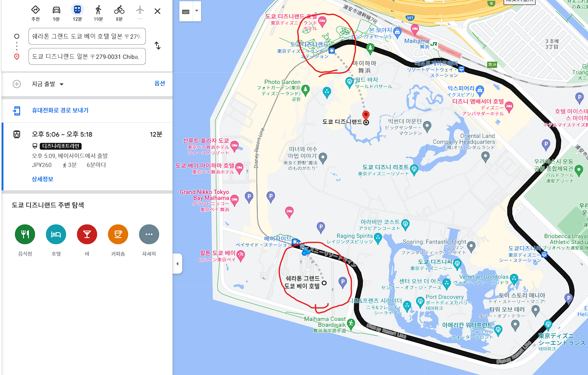 - 모노레일: 호텔에서 베이사이드 스테이션역까지 무료 셔틀, 디즈니랜드역까지 5분, 요금은 성인 260엔.