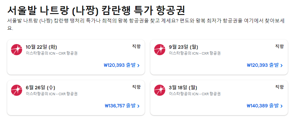 | 나트랑 항공권 최저가 구매 팁: 시즌별 가격 비교 (0) | 2023.12.23 |