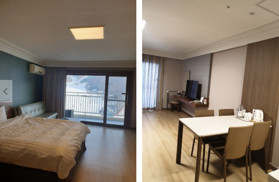 코로나 때문에 이용객이 줄어서 그런건지, 공사를 하는건지 리조트 앞쪽 주차장을 다 사용못하게 막아놓고 뒤쪽만 이용하게 했는데 안내판도 없고 A동 갔다가 운영을 안해서 B동으로 가는데 한바퀴돌아서 찾아갔어요.
