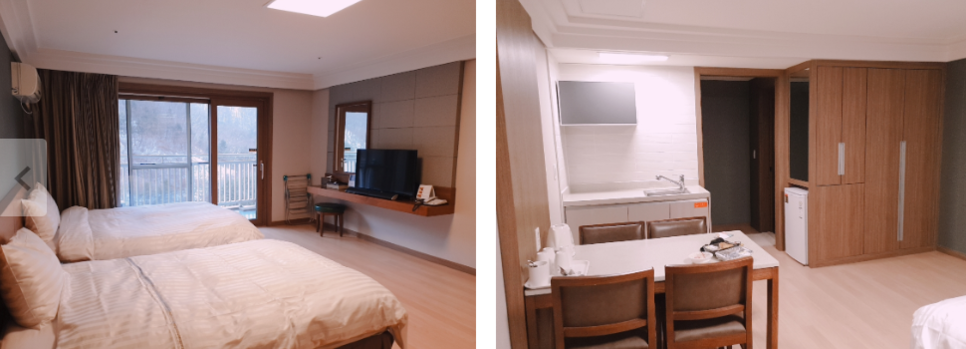 소노벨 비발디파크의 객실은 굉장히 넓어요. 바닥에 2인이 더 누울수 있을정도...리뉴얼 오픈이라 그런지 깨끗해요. 샴푸, 바디, 드라이어, 휴지, 타올 외에 다른 건 개인 준비물이에요.