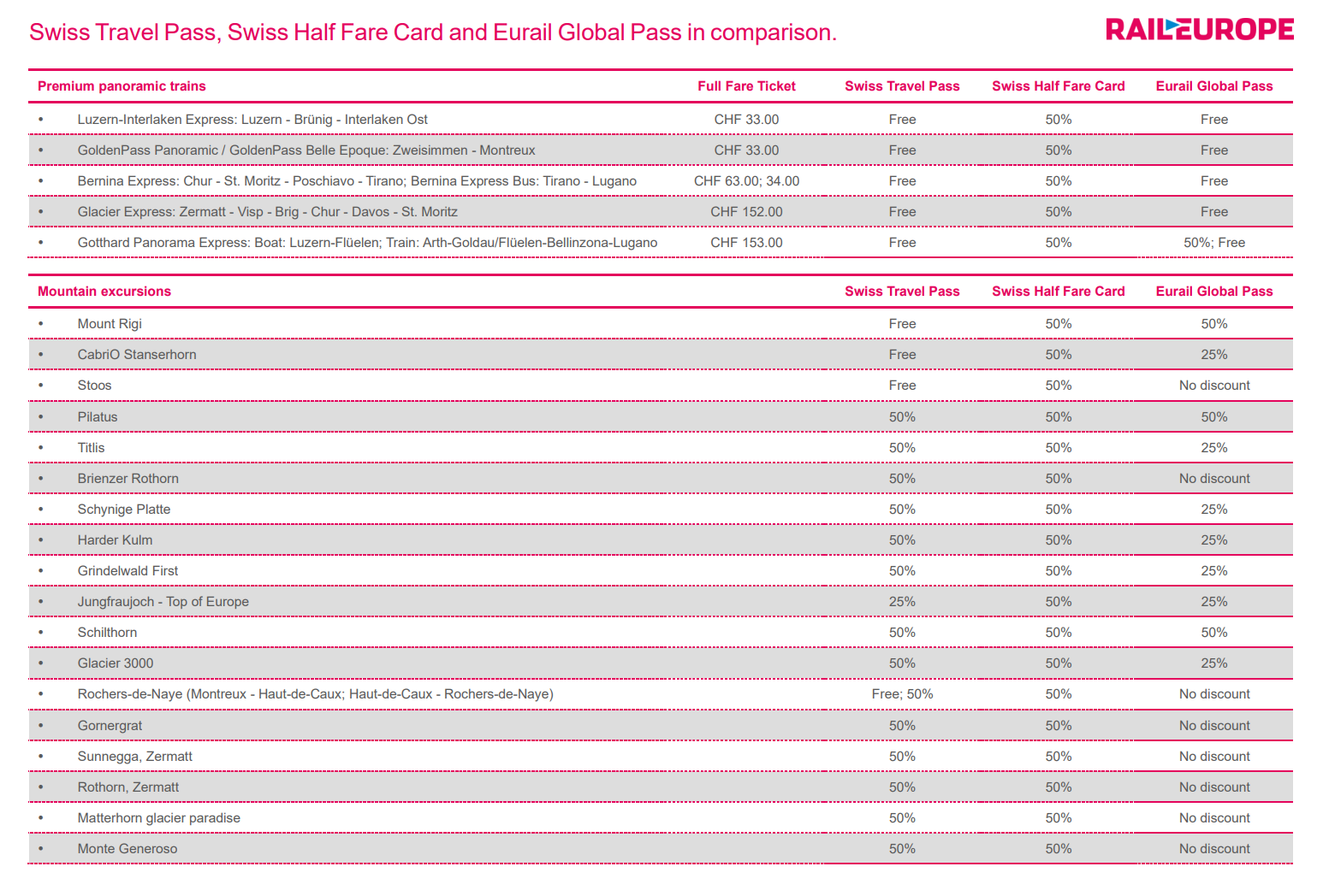 스위스 트래블 패스, 스위스 반액 카드, 유레일 글로벌 패스 비교