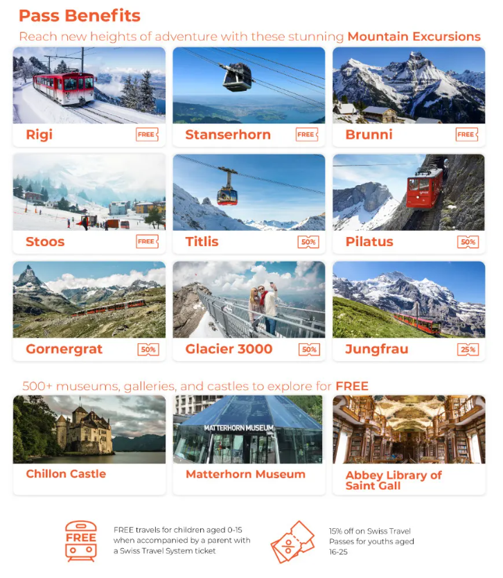 스위스는 유럽에서 가장 비싼 나라 중 하나이기 때문에 교통비가 부담될 수 있습니다. 하지만 스위스 트래블 패스를 사용하면 여러 번의 교통수단을 이용해도 추가 요금이 없습니다. 또한 스위스 트래블 패스를 소지하면 500여 개의 박물관과 산악 철도 등에 무료 혹은 할인된 가격으로 입장할 수 있습니다.