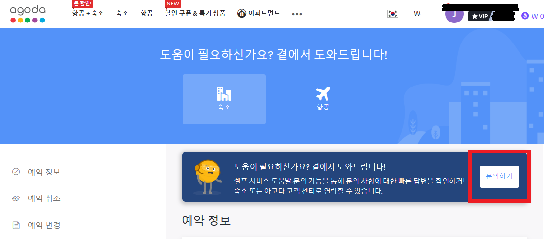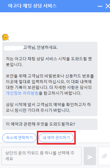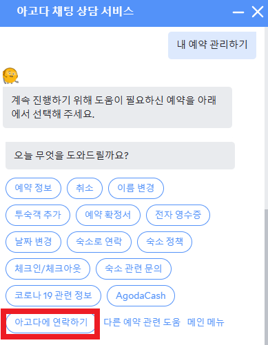 3. 아고다 채팅 상담서비스 --> 내 예약 관리하기 클릭