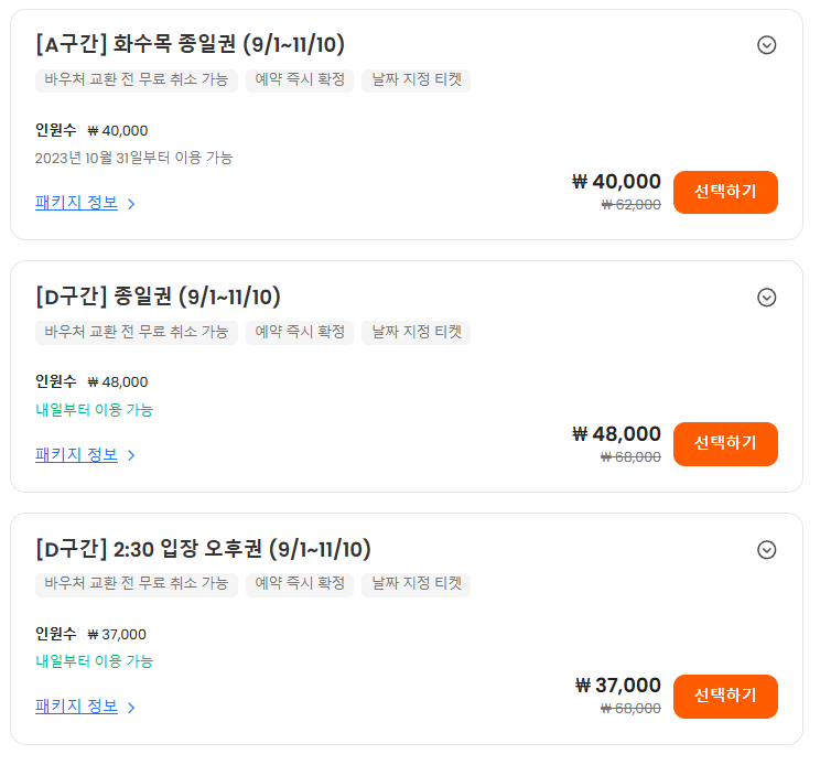 자유이용권은 시즌별로 A, B, C, D로 구분되어 가격이 달라집니다.