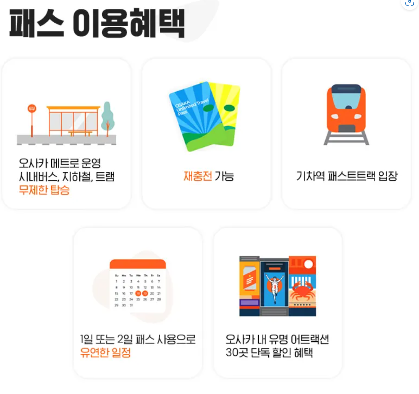 - 오사카의 30여개 관광 명소를 돌아보며 오사카 여행을 충분히 만끽할수 있는 오사카 주유패스 1일권/2일권