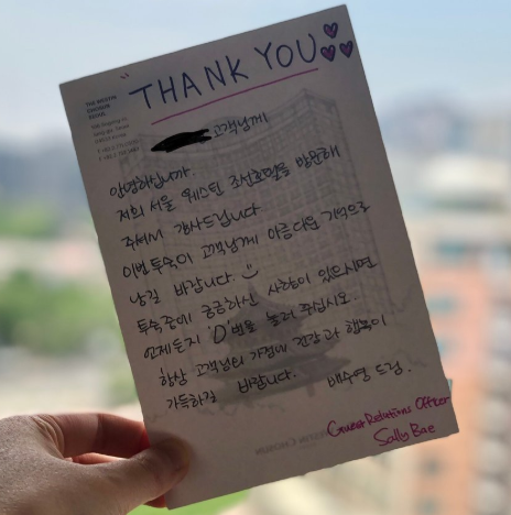 코로나로 인해 웨스틴조선호텔 서울방문이 조금 염려되는부분이 있었지만 프론트데스크의 배수영 직원분이 환하게 밝은 얼굴로 반갑게 맞아주시고 친절하게 객실까지 안내를 잘 해주셔서 편안하게 잘 머물렀다 갑니다.다음 서울 방문때도 웨스틴조선호텔 서울에 오고싶은 마음이 듭니다.(어머니께서 감동을 받으셔서 꼭!후기남기라고 하셔서 딸인 제가 후기 대신 남겨요^^