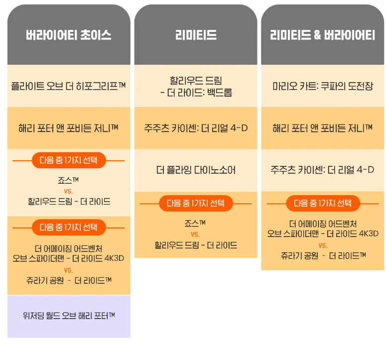- 특별 운영 또는 특별 시간을 위해 별도 티켓팅한 어트랙션에는 적용되지 않습니다.