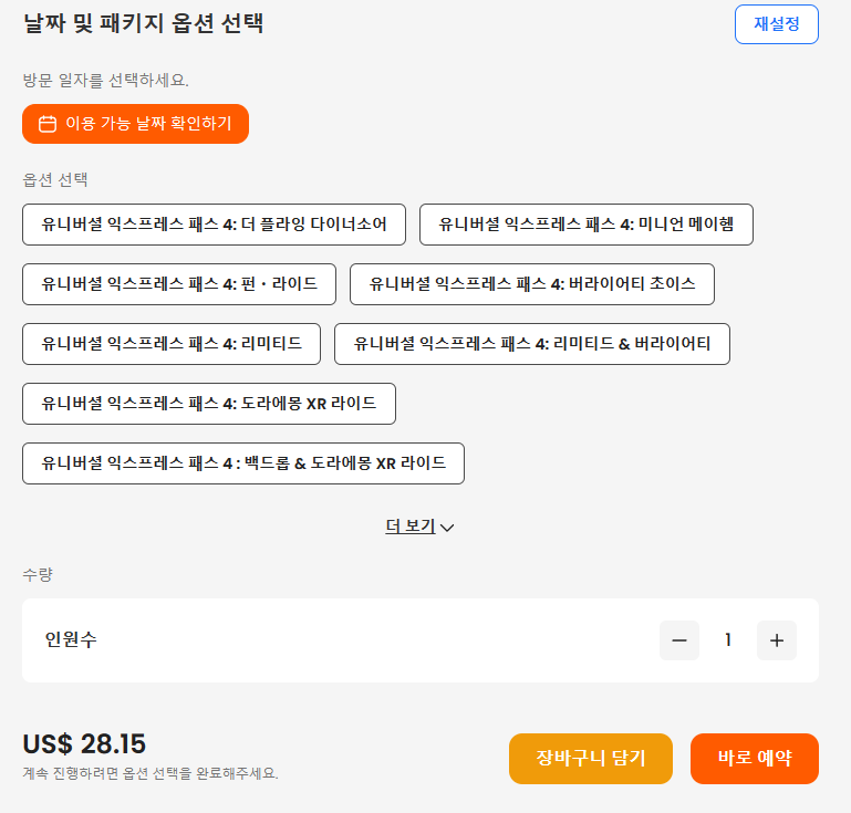 - 어트랙션이 이용 불가인 경우, 해당 익스프레스 패스는 익스프레스 적용 제외 어트랙션 중 하나에 1회 이용할 수 있습니다. 예약 완료 후, 변경 및 취소는 불가합니다. 예약 전 해당 부분을 미리 확인하시기 바랍니다.