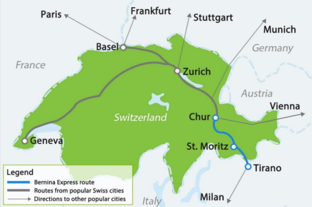 베르니나 익스프레스는 스위스와 이탈리아를 잇는 멋진 파노라마 열차입니다. 이 열차는 유네스코 세계 문화유산으로 지정된 레티쉐반(Rhaetian Railway)을 따라 알프스 산맥의 빙하와 호수를 지나며, 유럽에서 가장 높은 철도 건널목인 베르니나 단층 지괴(Bernina Pass)를 통과합니다. 이 열차는 쿠어(Chur)나 다보스(Davos)에서 출발하여 생모리츠(St. Moritz)를 거쳐 티라노(Tirano)에 도착하며, 여름에는 티라노에서 버스로 환승하여 루가노(Lugano)까지 연결됩니다.