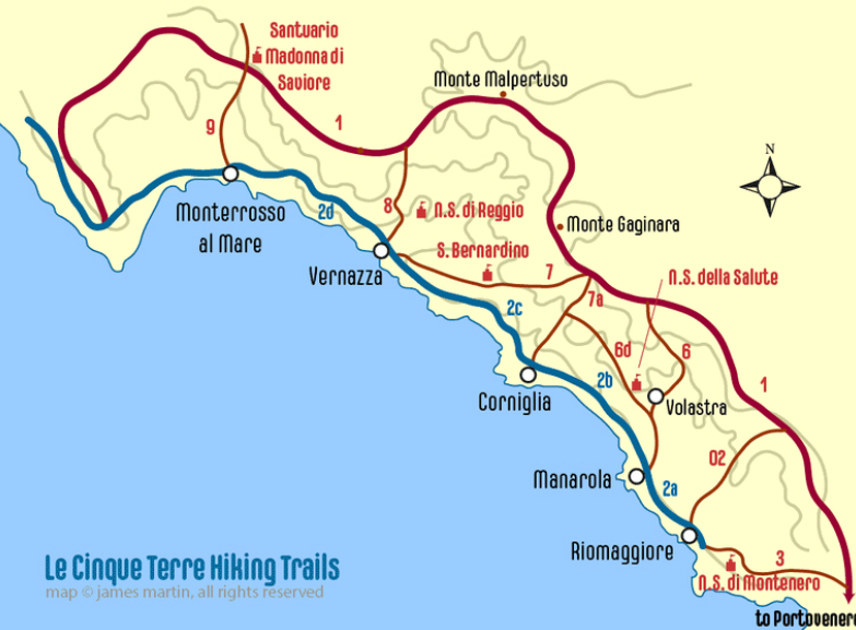 친퀘테레로 가는 가장 편리한 방법은 기차를 이용하는 것입니다. 밀라노에서는 라 스페치아(La Spezia)로 가는 인터시티(IC) 열차를 타고, 라 스페치아에서는 친퀘테레 5개 마을을 모두 정차하는 레지오날레(RE) 열차를 타면 됩니다. 유레일 패스를 사용한다면, 인터시티 열차는 좌석 예약비용을 따로 지불해야 하지만, 레지오날레 열차는 예약비용이 없습니다. 유레일 패스로 친퀘테레 5개 마을 간 이동도 무제한으로 할 수 있습니다.