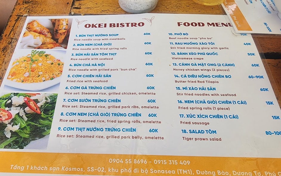 특징: 오케이 비스트로는 베트남 현지식을 다양하게 즐길 수 있는 곳으로, 쌀국수, 분짜, 볶음밥, 스프링롤 등을 제공합니다. 특히 망고 스무디는 이곳의 시그니처 음료로, 신선한 망고를 사용하여 만들어져 푸꾸옥의 열대 기후 속에서 시원하고 상큼한 맛을 선사합니다. 노보텔 리조트에 머무르는 여행객들에게 편리하게 접근할 수 있으며, 베트남 현지의 맛을 경험하고 싶은 이들에게 추천되는 곳입니다.