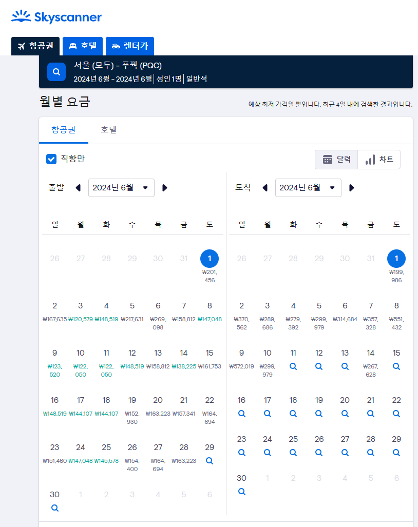 - 대한항공: 인천 출발 19:15, 푸꾸옥 도착 23:00 / 푸꾸옥 출발 00:30, 인천 도착 08:00